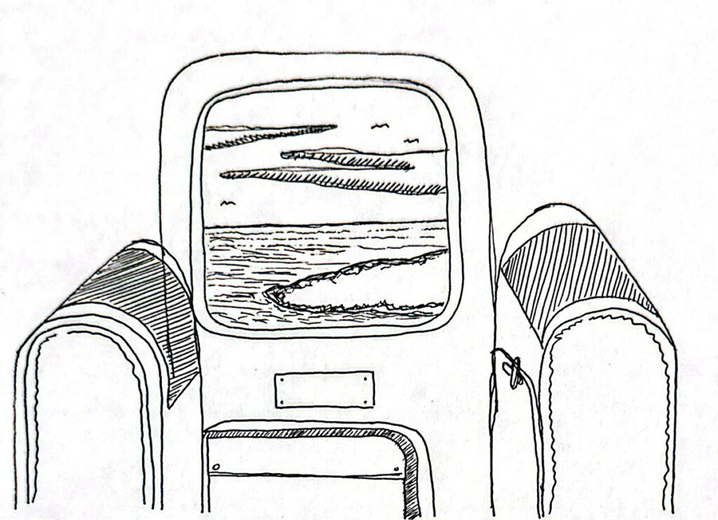 Appena dopo il decollo inizio a realizzare il motivo del viaggio: provare a scrivere qualcosa di sensato e non solamente qualcosa. Mi viene un po’ d’ansia e provo a distrarmi ascoltando la coppia seduta davanti a me.