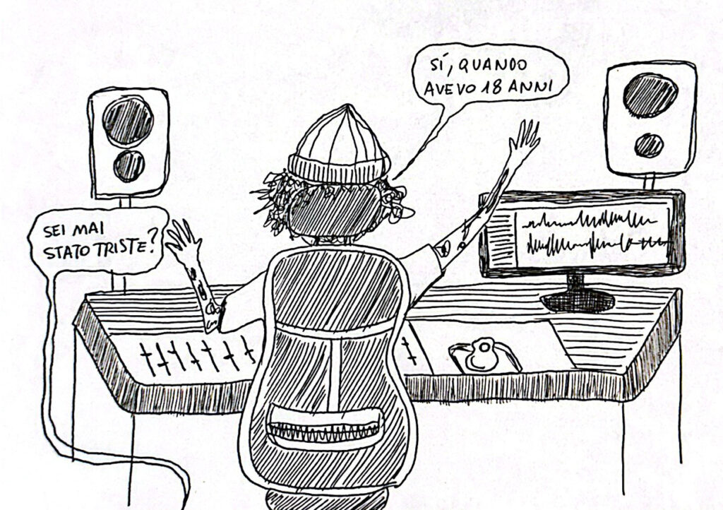 Dopo cena mi chiudevo in camera e illuminato da un faretto pinzato ad una mensola, scrivevo, disegnavo, provavo a elaborare delle idee ascoltando musica per ore. Sempre gli stessi due, tre CD a rotazione. Non avevo un pubblico, non c’era fretta, non esistevano i social e internet stava nascendo in quegli anni. Con gli altri dopo l’ultima ora di lezione, prendevamo la 95, io li seguivo anche in metro nonostante casa fosse lontana una sola fermata, ci salutavamo e poi silenzio stampa fino al giorno seguente. L’unico modo per rimanere in contatto erano gli SMS. Essere connessi era un termine a noi sconosciuto.